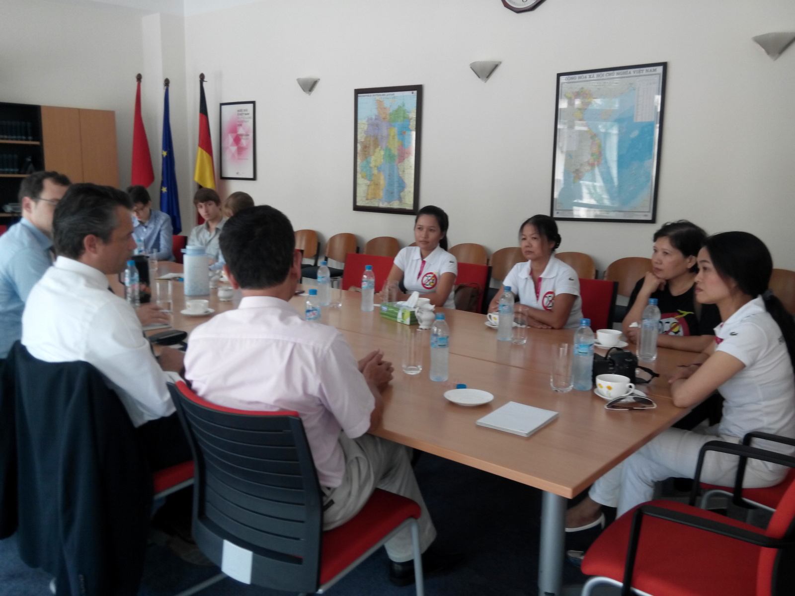 Hai viên chức cao cấp của sử quán Đức đã ra tận cửa để chào đón 5 nữ blogger can đảm của chúng ta, mục đích để ngăn chặn không cho công an sách nhiễu những blogger ngay trước cổng tòa đại sứ. 5 blogger này gồm có các chị: Đặng Bích Phượng (Phương Bích), Nguyễn Hoàng Vi, chị Lê Hiền Giang, Lê Thị Phương Lan và Đào Trang Loan.