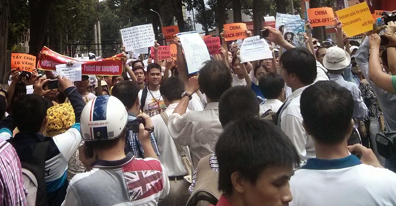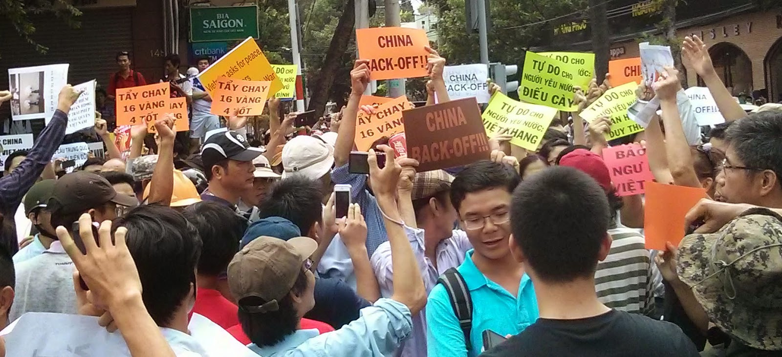 Lúc 09:30 phút sáng: Tại Sài Gòn, sau khi bị hàng rào an ninh dày đặc ngăn chặn tiếp cận tòa Tổng lãnh sự quán Trung Quốc, đoàn biểu tình đã quay ngược lại tuần hành hướng về khu vực nhà văn hóa Thanh Niên. Nhiều khẩu hiệu và tiếng hô 'Tự do cho người yêu nước' vang lên trong cuộc biểu tình. (Ảnh CTV Danlambao)