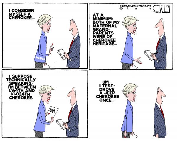 Bà Warren từng gây ra xì-căng-đan chính trị lớn khi bà đi vận động trong khu của bộ lạc da đỏ Cherokee tại Oklahoma, tự nhận là dân gốc Cherokee. Bị chất vấn, bà đi thử nghiệm DNA và được chứng nhận có 1 trên 1024 phần máu da đỏ. Chẳng ai biết các bác sĩ của bà đã thử nghiệm kiểu gì, chỉ biết đại khái là nếu lấy một lít máu của bà Warren ra đo, thì sẽ thấy chưa tới một milliliter là máu da đỏ, hay là chưa tới 15 giọt.