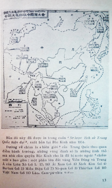 Ngay sau khi đánh bật Quốc dân đảng của Tưởng Giới Thạch và đẩy Tưởng ra đảo Đài Loan, chính quyền của Đảng cộng sản Trung Quốc đã vẽ nên tấm bản đồ “Sơ lược lịch sử Trung Quốc hiện đại”; và như các bạn đã thấy, trong tấm bản đồ nói trên được in trong cuốn “Sự thật quan hệ Việt Nam – Trung Quốc trong 30 năm qua”, Trung Quốc còn muốn lãnh thổ của mình gồm: một phần lớn vùng viễn đông trung Trung Á của Nga; toàn bộ nước Triều Tiên (Bắc Hàn, Nam Hàn), cùng với Bu Tan, Miến Điện, Nê Pan, Thái Lan, CPC, Lào, Việt Nam… và còn kéo tận xuống Malaysia, đồng thời chiếm luôn eo biển Malaca.